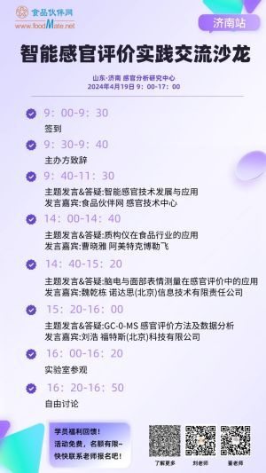 2024年4月19日,食品伙伴網(wǎng)、感知網(wǎng)聯(lián)合濟(jì)南智感分析儀器有限公司、濟(jì)南聯(lián)食檢測(cè)科技有限公司將在濟(jì)南舉辦第九期感官評(píng)價(jià)實(shí)踐交流沙龍。