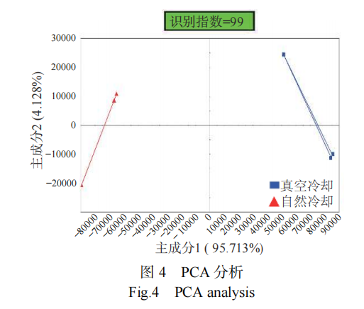 將本實驗電子鼻數(shù)據(jù)做主成分分析,如圖 4 所示。第一主成分的方差貢獻率為 95.713%,第二主成分的方差貢獻率為4.128%,兩個主成分的貢獻率之和達到 99.841%,能夠很好地反映樣品實際情況。同時,識別指數(shù)(discrimination index, DI)是用來表征樣品之間區(qū)分度大小的一種判斷方法,有效范圍在 80~100,且值越高說明得到的數(shù)據(jù)效果越好。在本實驗 PCA 分析中,識別指數(shù)達到 99,說明自然冷卻的醬牛肉和真空冷卻的醬牛肉可以很好地區(qū)分出來,且效果較佳。在主成分分析中,樣品之間相對距離越遠,表明樣品間氣味差異越大,從圖中可以看出兩種冷卻方式處理的醬牛肉之間距離較遠,在第一主成分方向顯示出明顯的分離,表明兩種醬牛肉氣味差異較為顯著,可以被很好地區(qū)分。