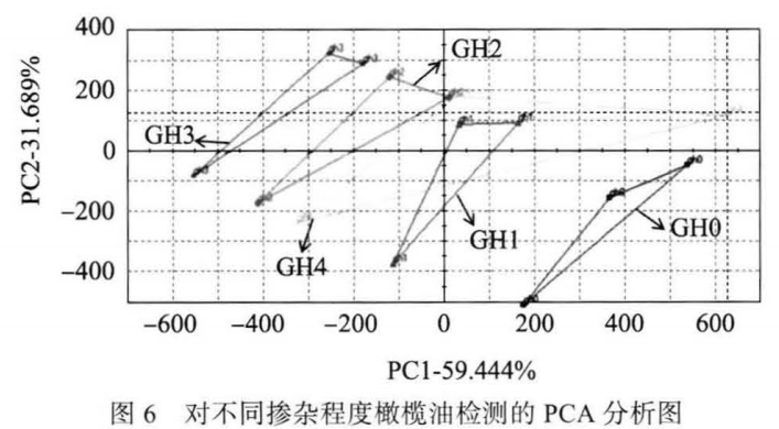 采用AlphaM.O.S公司的電子舌,對(duì)6種3組同類型、不同品牌、不同產(chǎn)地、不同生產(chǎn)工藝的油脂摻雜樣品進(jìn)行區(qū)分與識(shí)別,其檢測限可低至0.1%,識(shí)別指數(shù)為99分。相比于傳統(tǒng)的食用油摻假檢測,如油脂理化指標(biāo)檢測、氣相色譜法等,電子舌的檢測方法更靈敏,更準(zhǔn)確,并且可以區(qū)分成分相近的同種油脂,該檢測方法有助于食用油的地區(qū)保護(hù)、品牌保護(hù)。
