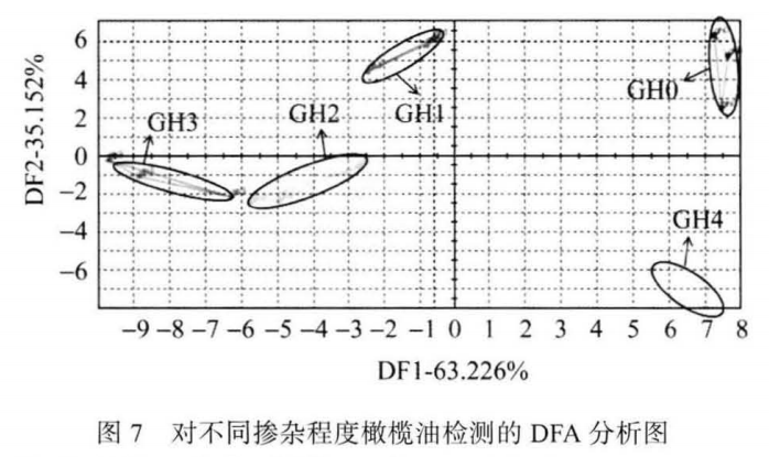 由圖6可知,2個(gè)主成分的貢獻(xiàn)率分別為59.444%、31.689%,總貢獻(xiàn)率可達(dá)9l_3l%,其中GH0為純的4號(hào)樣,GH4為純的3號(hào)樣,二者數(shù)據(jù)點(diǎn)分布區(qū)分明顯,并且由樣GHI與二者數(shù)據(jù)分布較遠(yuǎn)可以得出,檢測限可低至0.1%,仍可區(qū)分。由圖7可知,DFA方法的2個(gè)主成分貢獻(xiàn)率為63.226%、35.152%,總貢獻(xiàn)率可達(dá)98.38%,且純的3號(hào)樣與純的4號(hào)樣區(qū)分明顯,各摻雜比例的數(shù)據(jù)點(diǎn)分布也無重復(fù)區(qū)域。比較圖6,圖7可以看出DFA方法明顯優(yōu)于PCA方法。且2種方法都可以明顯地區(qū)分這兩者的摻雜。