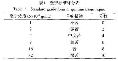 本文首先對大豆肽的苦味特性進(jìn)行人工感官評價(jià),然后冉研究電子舌儀器進(jìn)行感官分析。本實(shí)驗(yàn)從對苦味敏感的專業(yè)人員中選取10位感官評價(jià)員(5男5女)進(jìn)行感官評價(jià),每次品嘗之后,需要用清水漱口,再進(jìn)行下一次品嘗。最后,將與其口味接近的奎寧標(biāo)準(zhǔn)液濃度對應(yīng)的分值記為此溶液的得分。之后取10位評價(jià)人員的平均分為苦味評定分?jǐn)?shù)。以奎寧的作為評分標(biāo)準(zhǔn),評分標(biāo)準(zhǔn)見表1。表2為風(fēng)味蛋白酶不同水解時問下的苦味得分值。