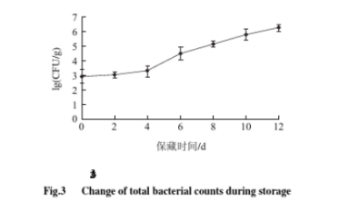 由上圖可知,保藏前4d TVB-N值上升比較緩慢,第4天開始上升加速,說明鱸魚品質(zhì)從第4天開始下滑較快;而由圖一感官得分的變化可知,從第2天開始鱸魚感官品質(zhì)明顯下降,說明在保藏初期鱸魚感官變化比TVB-N的變化更靈敏。第12天鱸魚的TVB-N值為21.6mg/100g,整個保藏過程中TVB-N值均為超過GB/T 18108-2008三級標(biāo)準(zhǔn)的要求(小于30mg/100g)。
