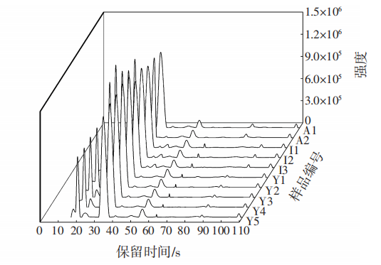 電子鼻基本參數(shù)設(shè)定:進(jìn)樣量5000μL、注射速度125μL/s、進(jìn)樣口溫度200℃、進(jìn)樣口壓力10kPa、捕集溫度40℃、采集時(shí)間110s、閥溫度250℃、檢測(cè)器溫度260℃、振蕩器攪拌速度500r/min。