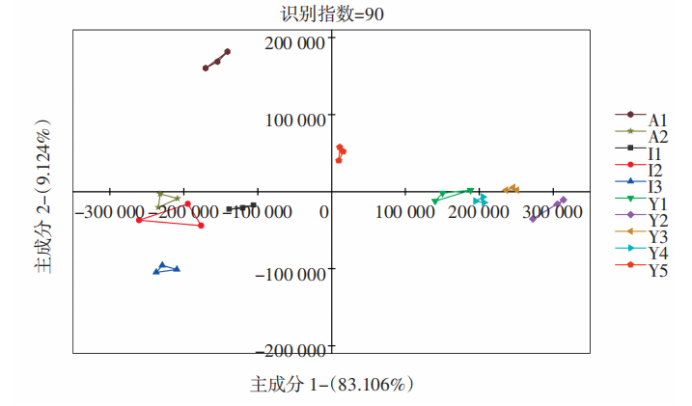 DFA結(jié)果分析對(duì)10種辣木籽電子鼻數(shù)據(jù)進(jìn)行DFA結(jié)果分析,見(jiàn)圖5。由圖5可知,I1、I2和I3分布在DF1正半軸,A1與A2分布在第二象限內(nèi),Y1、Y2、Y3、Y4和Y5則分布在第三象限內(nèi),說(shuō)明同一品種辣木籽的氣味相近,不同品種之間氣味上有較大差異。3個(gè)品種辣木籽響應(yīng)值分布在不同區(qū)域內(nèi)且無(wú)重疊,因此可用于判別不同品種辣木籽,與色譜圖分析一致。