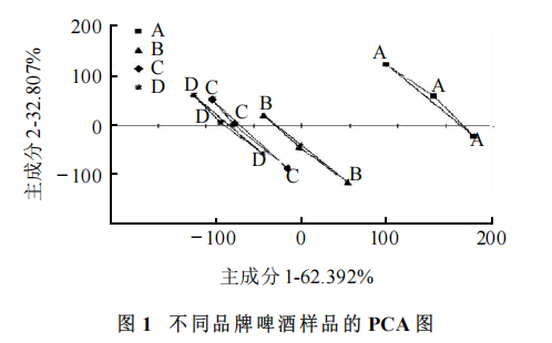 樣品準(zhǔn)備 樣品 C 和 D 進(jìn)行混合,混合比例 C:D(V/V)為 10:90 、30:70 、50:50 、70:30 、90:10 、100:0,編號(hào)分別為1、2、3、4、5、6。 傳感器信號(hào)分析 檢測(cè)每一個(gè)樣品時(shí)傳感器共采集120s 。在進(jìn)行數(shù)據(jù)分析與處理時(shí),采用第120秒所得的穩(wěn)定數(shù)據(jù)作為輸出值進(jìn)行分析。 數(shù)據(jù)分析方法 根據(jù)傳感器采集的原始數(shù)據(jù),分別采用主成分分析 (PCA) 、判別因子分析 (DFA)和偏最小二乘回歸分析(PLS)分析。 結(jié)果與分析 不同品牌啤酒對(duì)比 主成分分析(PCA) PCA 是將所提取的傳感器多指標(biāo)的信息進(jìn)行數(shù)據(jù)轉(zhuǎn)換和降維,并對(duì)降維后的特征向量進(jìn)行線性分類,最后在PCA圖上顯示主要的兩維圖。橫、縱坐標(biāo)分別表示在 PCA 轉(zhuǎn)換中得到的第一主成分(PC1)和第二主成分(PC2)的貢獻(xiàn)率(或權(quán)重) ,貢獻(xiàn)率越大,說(shuō)明主成分可以較好地反映原來(lái)多指標(biāo)的信息 。