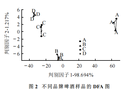 圖1為不同品牌啤酒樣品的主成分分析圖, 第一主成分和第二主成分的總貢獻(xiàn)率達(dá)到了95 .2% ,足以收集特征性信息。不同品牌的啤酒分別聚類在 PCA 圖中的不同區(qū)域,相互之間能夠較好地區(qū)分。 判別因子分析(DFA) DFA 是一種通過(guò)重新組合傳感器數(shù)據(jù)來(lái)優(yōu)化區(qū)分性的分類技術(shù),它的目的是使各個(gè)組間的重心距離最大同時(shí)保證組內(nèi)差異最小,在充分保存現(xiàn)有信息的前提下,使同類數(shù)據(jù)間的差異性盡量縮小,不同類數(shù)據(jù)間的差異盡量擴(kuò)大 。