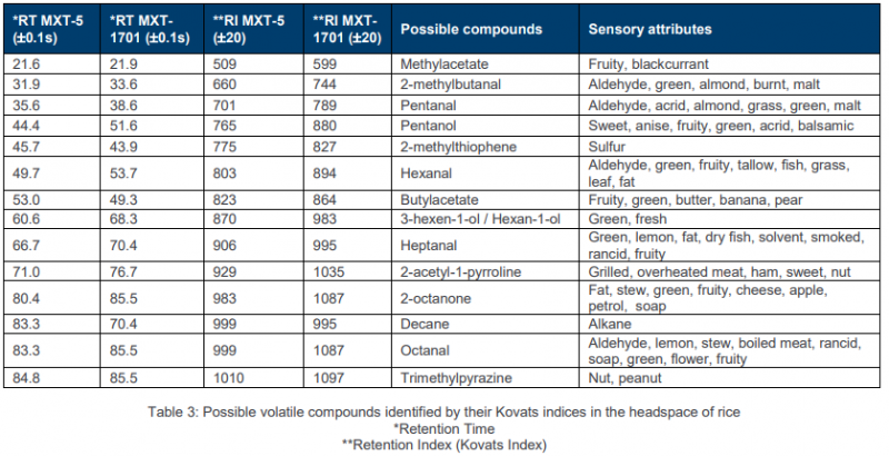 比較其己醛的含量可知大米的氧化水平,比較2-乙?;?1-吡咯啉含量可知其特征香味在大米中的含量。