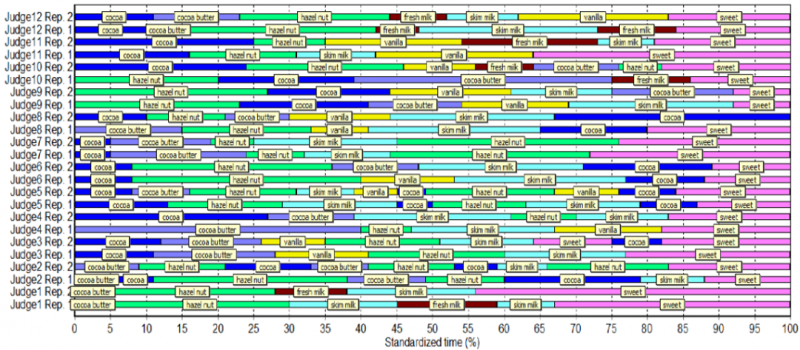 TDS品評(píng)法 旨在收集受試者在品嘗產(chǎn)品期間感知到的主要感覺的序列。例如,在品嘗一塊巧克力時(shí),從攝入到吞咽,品評(píng)人員可以依次感知可可、可可脂、榛子可可和甜味等屬性作為主導(dǎo)感覺。
