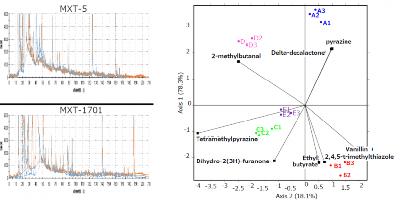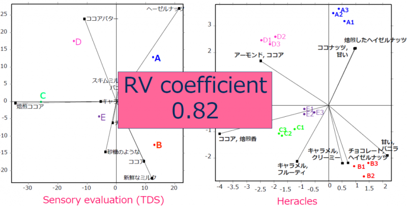 通過TDS持續(xù)時(shí)間生成的主成分分析圖:A,B,C,D,E 這幾個(gè)樣品都有不同的感官特征,比如A產(chǎn)品的榛子味濃一些,C產(chǎn)品的烤可可味更濃一些。