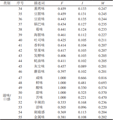分別對(duì)48 種市售醬油樣品的81個(gè)感官描述詞進(jìn)行強(qiáng)度評(píng)價(jià),并計(jì)算每個(gè)描述詞的M值。根據(jù)M值的排序,篩選出55個(gè)描述詞,其M值均大于0.2(表4)。M值較大的香氣描述詞有豆瓣醬香、熟黃豆香、燒焦氣、甜香等26 個(gè)描述詞匯;風(fēng)味描述詞有熟黃豆味、干果味、醋酸味、乙醇味等20個(gè)風(fēng)味描述詞;基本味道有咸味、鮮味、酸味、甜味和苦味5 個(gè)描述詞;口感有辛辣的、澀味、刺痛感和金屬味4 個(gè)描述詞。從M值上看,醬油的風(fēng)味具有咸、鮮、酸、豆瓣醬香、熟黃豆香/味、燒焦氣等特征,這與我國(guó)醬油的加工原料、發(fā)酵工藝有關(guān)。