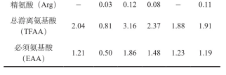 由表4可知,啤酒鴨中共檢測(cè)到16種游離氨基酸,其7種人體必需氨基酸中苯丙氨酸、蘇氨酸、異亮氨酸、亮氨酸、纈氨酸在所有啤酒鴨中均有檢出。清醇組及清水對(duì)照組中各氨基酸均能檢出(16種),白啤組氨基酸種類(lèi)次之(15種),種類(lèi)最少為奧古特組(11種)。