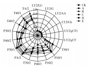 圖4是6種不同烹飪熟度的牛排揮發(fā)性風(fēng)味化合物譜圖,圖中每個點代表一種物質(zhì),淺色表示濃度較低,深色表示濃度較高,顏色越深表示濃度越大7。由圖4可知,牛排的揮發(fā)性風(fēng)味物質(zhì)能通過GC-IMS得到很好的分離,其中圖中標(biāo)記的橫線和方框處為6種不同熟度牛排中的差異性化合物,隨著牛排成熟度的增加,樣品中化合物的數(shù)量和濃度不斷增加,并且均高于對照組,其中在樣品A、B中,化合物的整體濃度較相似,即牛排介于一成熟和三成熟之間時,樣品的整體風(fēng)味輪廓較相似,而在樣品D、E中,化合物的整體風(fēng)味物質(zhì)的濃度較相似,說明牛排介于七成熟和九成熟之間時,樣品的整體輪廓較相似,與前文電子鼻結(jié)果一致。
