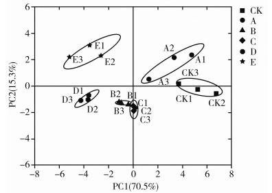 與樣品CK相比,部分化合物在樣品A、E中具有較高的含量,說明這部分物質(zhì)是烹飪后產(chǎn)生的,牛排在烹飪過程中由于高溫產(chǎn)生的美拉德反應(yīng)或者脂質(zhì)的熱分解產(chǎn)生的一系列揮發(fā)性風(fēng)味物質(zhì),導(dǎo)致烹制后的牛排風(fēng)味更豐富。