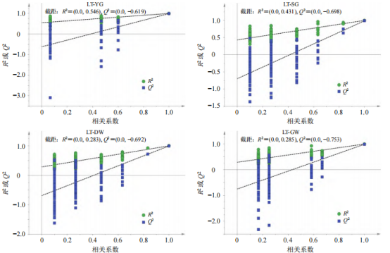 略燙后曬干品與其他加工品的氣味差異分析利用OPLS-DA將該加工品與市場主流的陰干品、直接曬干品、低溫烘干品、高溫烘干品分別進(jìn)行比較并進(jìn)行置換檢驗(yàn),確認(rèn)4組比較分析均未出現(xiàn)過擬合,將變量重要性投影(VIP)大于1的成分視為主要差異成分。得分散點(diǎn)圖見圖4,置換檢驗(yàn)圖見圖5,VIP圖見圖6。