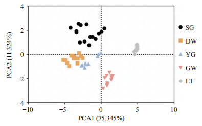 繪制聚類熱圖以呈現(xiàn)不同加工品揮發(fā)性成分整體特征的異同(圖3)。熱圖顯示,5類太子參加工品中,略燙后曬干品LT1~LT6單獨(dú)聚為一類,高溫烘干品GW1~GW4單獨(dú)聚為一類,低溫烘干品DW1~DW5單獨(dú)聚為一類,陰干品YG1~YG3、直接曬干品SG3聚為一類,直接曬干品SG1、SG3~SG5聚為一類,結(jié)果說明略燙后曬干品、高溫烘干品、低溫烘干品之間的揮發(fā)性成分差異較大,而直接曬干品與陰干品較為相似。