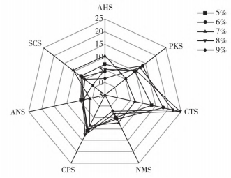 不同樣品酸味、甜味、苦味、咸味、鮮味5個滋味的排序見圖3,電子舌傳感器相對強(qiáng)度值存在明顯差異,表明電子舌測試可有效地區(qū)分不同樣品的滋味。5個樣品在ANS傳感器上的響應(yīng)強(qiáng)度無明顯差異,在SCS、PKS、NMS、CTS、CPS、AHS傳感器上的響應(yīng)強(qiáng)度存在差異,不同樣品的酸味、咸味、鮮味相對強(qiáng)度值從小到大的順序為酸味排序:6%<8%<9%<7%<5%,咸味排序:6%<9%<8%<7%<5%,鮮味排序:6%<8%<9%<7%<5%。