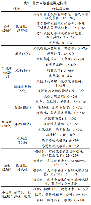 邀請(qǐng)10位具有感官品評(píng)經(jīng)驗(yàn)的人員,對(duì)苦蕎米飯進(jìn)行感官評(píng)價(jià),評(píng)分細(xì)則見(jiàn)表3。