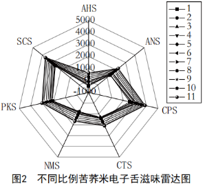 通過(guò)味覺(jué)分析比較發(fā)現(xiàn)不同比例苦蕎米飯的滋味呈現(xiàn)一定的規(guī)律性,隨著苦蕎米添加量的增大,各傳感器的響應(yīng)值也隨之增大。上述結(jié)果表明,不同比例的苦蕎米飯滋味會(huì)因苦蕎米添加量的不同而逐漸變化。這一結(jié)果表明,不同比例的苦蕎米飯滋味會(huì)因苦蕎米添加量的不同而逐漸變化。