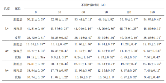 表1 預(yù)制紅燒肉凍藏過程色澤變化