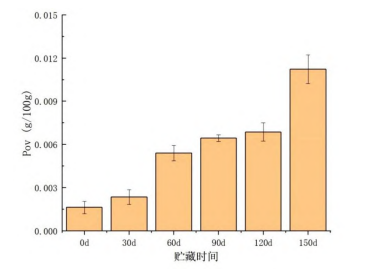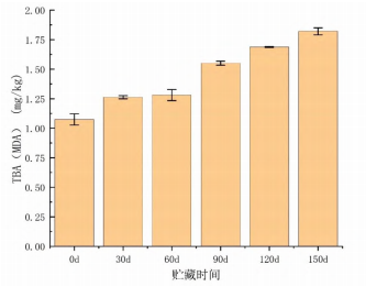 過氧化值是反映油脂氧化的重要指標(biāo),不同貯藏期的POV值如圖1所示。在-18℃條件下,預(yù)制紅燒肉的過氧化值隨貯藏時間增加而增長,其中只有60d和150d有明顯增加。不同貯藏時期的TBA反應(yīng)物值如圖2所示,TBA值隨貯藏時間顯著上升(P<0.05),貯藏0d的MDA含量約為1.07mg/kg,貯藏150d后,MDA含量增加到1.75mg/kg,這是因?yàn)檫^氧化物的不穩(wěn)定性質(zhì)會進(jìn)一步的分解為二次氧化產(chǎn)物如丙二醛。但預(yù)制紅燒肉在-18℃條件凍藏150d的過氧化值和丙二醛含量均低于GB10146—2015的限制量,仍保持在安全的范圍內(nèi)。