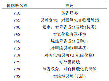 表3 電子鼻傳感器名稱及特征