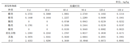 新鮮紅燒肉至150d揮發(fā)性物質(zhì)分別為57種、72種、49種、60種、66種、57種。整個貯藏期醛類物質(zhì)和酸類物質(zhì)種類數(shù)量先增加再減少,醇類、烴化合物和其他類揮發(fā)性物質(zhì)數(shù)量呈現(xiàn)先增多然后減少再增多的現(xiàn)象,酮類物質(zhì)種類數(shù)量隨時間增加。但各個貯藏期各類揮發(fā)性物質(zhì)的含量呈現(xiàn)先上升再下降的現(xiàn)象,其中120d起于之后的兩個貯藏期相比揮發(fā)性物質(zhì)含量有較大的降低,表明氣味隨凍藏時間的延長,前期變化小,而120d后風(fēng)味有所衰減,但衰減程度不大,對整體風(fēng)味品質(zhì)影響不大。