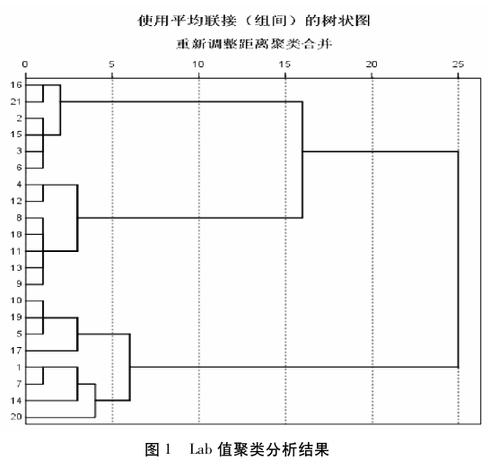 綜合Lab值和RGB值聚類分析,兩個顏色系統(tǒng)都可以對黃桃罐頭色澤進行分類,但是RGB值更接近于人眼視覺,能更好的對黃桃罐頭進行分類。