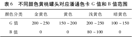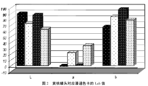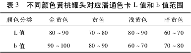 為了減少其他因素的干擾如品牌、價格、廣告、經(jīng)驗等方面的影響,本實驗決定采用雙盲法進行檢驗。所有的樣品都用3個隨機的數(shù)字進行編碼,檢驗樣品也隨機化。在進行試驗之前罐頭要先打開5min,再將桃片放在白色瓷盤上。由訓(xùn)練型評價員以潘通色卡為參比物,尋找和黃桃罐頭相對應(yīng)的色卡,記錄下其Lab值和RGB值,然后再由訓(xùn)練型評價員根據(jù)經(jīng)驗,按照金黃色、黃色、淺黃色、暗黃色將其分為四類。