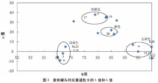 黃桃罐頭對應(yīng)潘通色卡a值和b值分布見圖4,由圖可以看出淺黃色的a值、b值都是最低,暗黃色的a值最大,金黃色的b值最大。從而可以得出金黃色、黃色、淺黃色、暗黃色四類顏色的a值和b值范圍見表4。