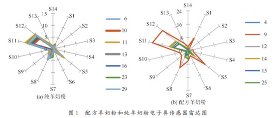 配方羊奶粉和純羊奶粉的雷達(dá)圖如圖1所示。兩類(lèi)奶粉在S5、S8、S11、S12等傳感器中均表現(xiàn)出更高的響應(yīng)值,說(shuō)明羊奶粉中揮發(fā)性物質(zhì)主要對(duì)應(yīng)于這幾個(gè)傳感器的物質(zhì),推測(cè)可能主要是醛酮類(lèi)、酸類(lèi)、烷烴類(lèi)、醇類(lèi)。除此之外,與純奶粉相比,部分配方羊奶粉在S1、S7、S9、S10還有較突出的響應(yīng)峰出現(xiàn),推測(cè)可能主要是胺類(lèi)、氨類(lèi)及烷烴物質(zhì)。