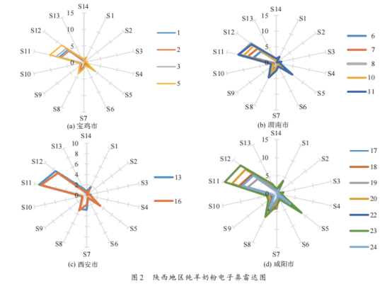 羊奶是最接近母乳的乳品,富含200多種營(yíng)養(yǎng)素和生物活性物質(zhì),具有較高的生物利用度,是消費(fèi)者的理想食物。目前,羊奶市場(chǎng)的主要產(chǎn)品形式是羊奶粉,羊奶粉品牌的逐漸擴(kuò)增,使市場(chǎng)上的羊奶粉質(zhì)量評(píng)價(jià)成為值得關(guān)注的話題。本文對(duì)陜西地區(qū)和非陜西地區(qū)的產(chǎn)地來(lái)源,純羊奶粉、中老年配方羊奶粉、嬰幼兒配方羊奶粉、學(xué)生配方羊奶粉等常見(jiàn)羊奶粉產(chǎn)品種類(lèi),基于電子鼻、電子舌技術(shù)開(kāi)展了市售羊奶粉質(zhì)量的評(píng)估檢測(cè)。
