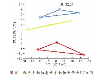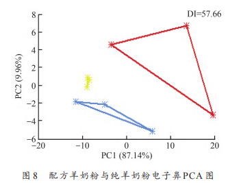 電子鼻測(cè)定純羊奶粉及配方羊奶粉的PCA結(jié)果見(jiàn)圖8。PCA結(jié)果將奶粉歸為3個(gè)區(qū)域,分別為紅色區(qū)域,黃色區(qū)域以及藍(lán)色區(qū)域,溯源到奶粉種類(lèi)發(fā)現(xiàn)紅色區(qū)域?yàn)榕浞窖蚰谭?,黃色區(qū)域?yàn)榕浞窖蚰谭叟c純羊奶粉等比例混合,藍(lán)色區(qū)域?yàn)榧冄蚰谭?。純羊奶粉、配方羊奶粉以及混合奶粉距離較遠(yuǎn),區(qū)分度較好。綜上,電子鼻可實(shí)現(xiàn)對(duì)純羊奶粉及配方羊奶粉的區(qū)分。