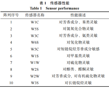 傳感器清洗時間180s,每個酒樣8mL,每隔1s取1次樣,連續(xù)測定時間90s,內(nèi)部流量300mL/min,進樣流量200mL/min。傳感器對不同物質(zhì)的性能如表1所示。