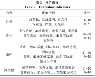 感官評價指標參照G/BT1538—2006《葡萄酒、果酒通用分析方法》及DB45/T1835—2018《地理標志產(chǎn)品黃姚黃精酒》評定方法評價,其中外觀(10分)、香氣(30分)、滋味(40分)、典型性(20分),由15人(年齡20-35周歲,男7名,女8名)組成評價小組對酒樣進行感官評定,取平均值。