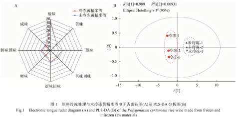 電子舌雷達圖(圖1A)顯示,冷凍黃精釀造的黃精米酒較未冷凍的酸味上升、咸味和鮮味下降,苦味、澀味、苦味回味、澀味回味及鮮味回味無明顯變化;從圖1B可以看出,兩種樣品的3個重復樣本分布集中,均落在95%置信橢圓內(nèi),自變量擬合指數(shù)R2X為0.989,表明同種釀造原料的黃精米酒重復性好;冷凍與未冷凍處理的黃精米酒在橫軸上實現(xiàn)品種區(qū)分,冷凍黃精米酒分布于橫軸負半軸,未冷凍的分布在正半軸。