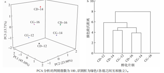 圖2 不同包裝方式醇化片煙電子眼的PCA分析(a)及聚類圖(b)