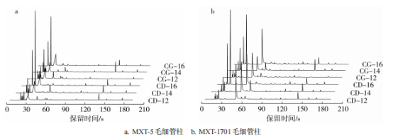 對(duì)充氮和常規(guī)包裝的醇化片煙樣品進(jìn)行快速氣相電子鼻分析,得到2根不同極性色譜柱對(duì)應(yīng)的揮發(fā)性成分指紋圖譜,結(jié)果如圖3所示??梢钥闯觯煌b片煙的色譜峰在52~68個(gè)之間,其峰面積也不相同,說明樣品揮發(fā)性成分種類和含量存在一定差異。且不同醇化時(shí)間下,同一包裝片煙的揮發(fā)性成分種類和含量也有明顯差別。