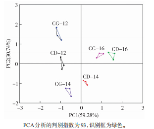 對(duì)樣品的電子眼數(shù)據(jù)進(jìn)行PCA分析,結(jié)果如圖2a所示。可以看出,主成分1(PC1)、主成分2(PC2)和主成分3(PC3)之和達(dá)到了82.71%,可代表樣品的絕大部分信息。同時(shí),判別指數(shù)是用來表征樣品之間區(qū)分度大小的一種判斷方法。本實(shí)驗(yàn)中煙葉顏色的判別指數(shù)(評(píng)價(jià)選定目標(biāo)的判別質(zhì)量)為100,說明通過電子眼能有效區(qū)分不同包裝樣品的顏色差異,且存在一定可靠性。另外,不同樣品各自聚在一起,說明在不同包裝和醇化時(shí)間下樣品顏色分布均存在明顯差異。基于歐氏距離可以判斷不同處理間樣品差異程度。圖2b中CD-12、CD-14、CD-16、CG-12和CG-14處理聚為一組,說明其顏色存在一定相似性;而CG-16處理與其他處理距離最遠(yuǎn),說明其顏色與其他樣品差異最大。故從煙葉顏色看,充氮包裝處理在一定程度上延緩了醇化過程煙葉顏色的褐變加深。