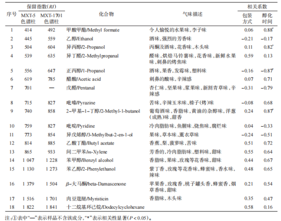 在PCA分析的基礎(chǔ)上,將各組分的保留時(shí)間轉(zhuǎn)化為保留指數(shù),再通過AroChembase數(shù)據(jù)庫(kù)(包括15萬種化合物的保留指數(shù)值)進(jìn)行定性,篩選出了18種可能的差異揮發(fā)性成分,并進(jìn)行感官描述。醇化片煙揮發(fā)性差異成分、感官描述信息及相關(guān)系數(shù)見表1??梢钥闯?,不同包裝方式和醇化時(shí)間片煙中的主要揮發(fā)性差異化合物包括醇類(7種)、醛類(2種)、酯類(2種)、雜環(huán)化合物(2種)和其他化合物(5種)。結(jié)合圖3的峰面積可知,各處理醇化片煙中含量較高的化合物均為醋酸、異丙醇、甲酸甲酯、β-大馬酮和戊醛。