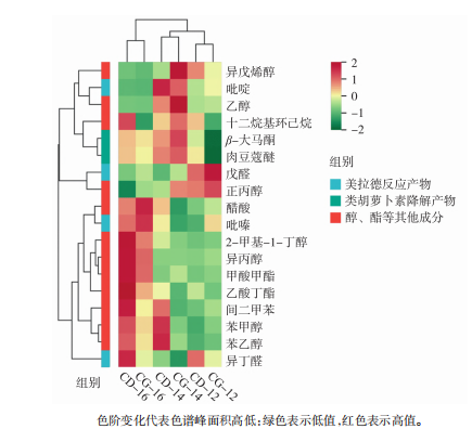 為確定差異揮發(fā)性化合物對(duì)醇化片煙氣味的貢獻(xiàn)程度,篩選出的主要差異化合物進(jìn)行ROAV分析,采用面積歸一化法計(jì)算化合物的相對(duì)含量,采用AroChembase數(shù)據(jù)庫(kù)和文獻(xiàn)中檢索到的化合物氣味閾值為嗅覺閾值。18種主要差異化合物中,β-大馬酮的相對(duì)含量較高,且嗅覺閾值較低,因此定義CG-14中的β-大馬酮(相對(duì)含量最高)的ROAV值為100。