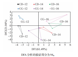 為進(jìn)一步分析不同包裝方式醇化片煙香氣成分的差異,對(duì)3個(gè)醇化期不同包裝方式的片煙樣品揮發(fā)性成分指紋圖譜進(jìn)行了判別因子分析(DFA),結(jié)果如圖5所示。電子鼻的判別因子影響值總和為92.67%(DF1為80.76%,DF2為11.91%),驗(yàn)證得分94。從DFA模型圖中可以看出,醇化12、14月時(shí),兩種包裝煙葉的氣味主要在DF2有明顯區(qū)別;而醇化16月時(shí),充氮包裝與常規(guī)包裝的片煙在DF1和DF2均有差別。整體來看,DFA判別模型結(jié)果與氣味指紋圖譜的PCA分析結(jié)果相吻合,說明通過電子鼻能有效區(qū)分不同包裝方式醇化片煙樣品揮發(fā)性成分的差異。