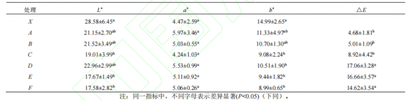 羊肚菌復水后的色差值△E順序為A處理>B處理>C處理>F處理>E處理>D處理,A、B、C處理的色差值△E與新鮮羊肚菌X無顯著性差異(P>0.05),說明這幾種干燥處理方法對羊肚菌的顏色影響相對較小,能夠保證羊肚菌復水以后的外觀色澤,有利于商品性的提升。