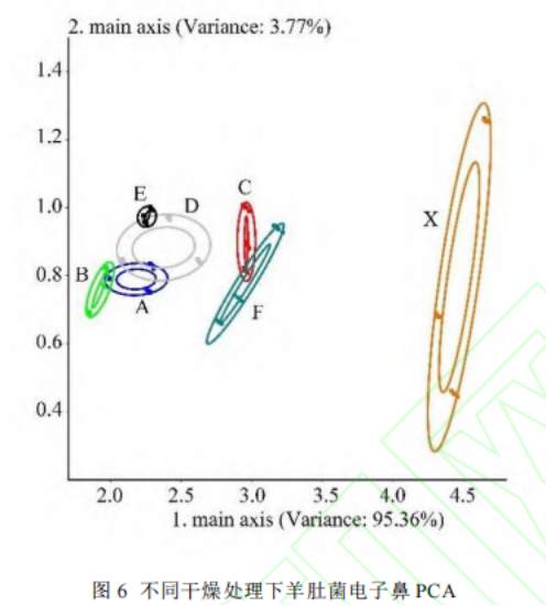 電子鼻對不同干燥處理羊肚菌氣味的PCA(圖6)可知,第一主成分(PC1)和第二主成分(PC2)的貢獻率分別為95.36%、3.77%,累計貢獻率能代表羊肚菌樣品揮發(fā)性氣味化合物的主要信息。新鮮羊肚菌樣品與不同干燥處理的羊肚菌樣品均無重疊,在PC1維度上,差異顯著,表明干燥處理后羊肚菌的風味物質(zhì)發(fā)生了明顯改變。C和F處理在保留新鮮羊肚菌原有氣味化合物方面效果更佳,相比其他干燥方法更具優(yōu)勢,而B處理則損失了更多風味物質(zhì)。