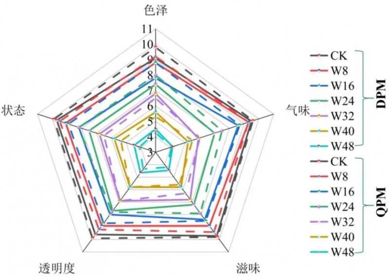 圖1為兩種核桃油隨貯藏時(shí)間延長(zhǎng)得到的感官評(píng)分雷達(dá)圖,DPM和QPM核桃油感官品質(zhì)在貯藏0周感官評(píng)分相近且處于較高水平,分別為9.50分和9.80分,表明初始品質(zhì)良好。隨著貯藏時(shí)間延長(zhǎng),兩者感官評(píng)分均呈下降趨勢(shì),其中QPM從第8周開始呈現(xiàn)顯著的下降趨墊,而DPM則從第16周開始呈現(xiàn)顯著下降趨勢(shì)(P<0.05),目整個(gè)貯藏過程中,QPM的下降幅度總體大于DPM。推測(cè)可能是慶為去仁衣核桃油更易發(fā)生氧化、水解等反應(yīng),產(chǎn)生如醛、酮、游離脂肪酸等異味物質(zhì),從而導(dǎo)致風(fēng)味、色澤和氣味等感官品質(zhì)的快速劣化;相比之下,DPM的感官評(píng)分下降相對(duì)緩慢,這很可能得益于核桃仁衣中含有多種抗氧化成分的保護(hù)作用,它們可以有效清除自由基,減緩氧化反應(yīng)的進(jìn)行,進(jìn)而延緩感官品質(zhì)的下降。然而,QPM的色澤在初期明顯優(yōu)于DPM,這可能與核桃仁衣中的色素在壓榨過程中溶出有關(guān),使得DPM顏色較QPM略深且透明度較差。
