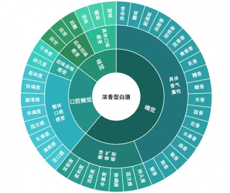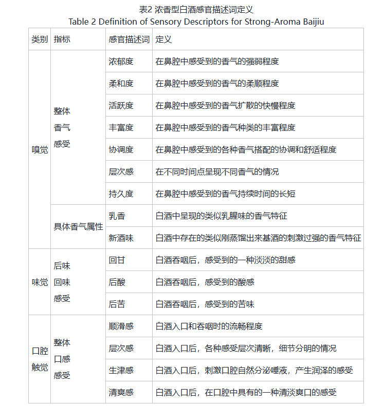 1、Pivot - CATA法的評價指標確定對采用 Pivot Profile 法收集到的大量感官描述詞進行整理后,共收集感官描述詞 1203個,其中不重復出現的詞匯有 177 個。通過合并同義詞、刪除定量描述詞(如較、略有、略帶、稍有等)以及去除無關術語后得到 34 個描述詞,但考慮到 Pivot Profile 方法側重捕捉樣品差異可能會忽略一些共性特征,又將這次詞匯結合白酒風味輪、濃香型白酒文獻中出現的感官描述詞、相關標準中出現的感官描述詞進行整合、歸納,重點補充 Pivot Profile實驗中未出現但屬于濃香型白酒特征風味的感官描述詞,最終擴充到 71 個不重復出現的候選描述詞。在此基礎上,邀請專家品酒師綜合濃香型白酒風味特征對這些詞匯進行交流討論,進行了刪除、合并、調整等處理。包括刪除了口語化描述詞,如水味;去掉了出現頻率較少的描述詞,如咸菜味、鮮味等;刪掉其它白酒香型的典型描述詞,如藥香、清香、醬香;去掉詞義籠統(tǒng)不明的詞匯,如酒香、幽雅度、發(fā)酵香等;刪除偏化學術語并不方便在消費者中傳播、同時又蘊含果香花香等特征的詞匯,如醇香、酯香、醛香;同時為了便于品評操作,合并負面描述詞餿味、腥味、油漆味等統(tǒng)稱為異雜味;合并了詞義相近描述詞,如將舒適度歸于柔和度中;考慮到濃香型白酒因釀造工藝原因達不到焦香和糊香程度(在醬香型白酒中常出現),所以選擇焙烤香;而清爽感更傾向于口感描述,在口感中保留。最終得到高共識度的 41 個用于 Pivot - CATA 品評實驗的描述詞,確保了詞匯的名詞詞性清晰性、表達準確性、不同詞匯含義間的無交叉性,這次詞匯覆蓋了體現樣品間差異的嗅覺、味覺和口腔觸覺等不同維度,詳見圖 3。相比國家標準 GB/T 33405-2016《白酒感官品評術語》,新增了 16 個描述詞,其具體含義見表 2。